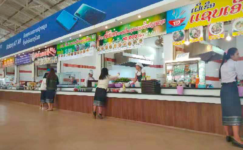 不同的食物由不同的窗口售賣,當然打飯的窗口跟中國“玻璃窗后的阿姨似乎總有點手抖”不同,老撾國立大學的食堂窗口更像展會現(xiàn)場的攤位,制服統(tǒng)一的阿姨笑容滿面地等待你的到來。
