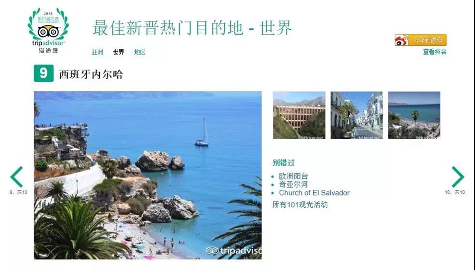 西班牙的兩座城市也分別進(jìn)入了歐洲最佳熱門(mén)目的地和世界最熱門(mén)旅游目的地榜單:內(nèi)爾哈,位列歐洲第四,世界第九;加的斯,位列歐洲第八。