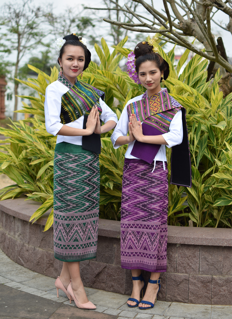 老撾女士一般都有多套正裝行頭,面料看起來明顯出自于手工紡織。女士的正裝色彩斑斕,配上做工考究的民俗圖案和珠璉佩飾,給人一種質(zhì)樸、莊重的感覺。年輕女士的正裝顏色豐富,以鵝黃、桔橙、粉色、淡紫為主要色彩;中老年女士的正裝則青睞深紫、咖啡、墨綠、深藍等顏色。老撾人在集會時,一定會正裝出席,一改平日休閑、隨意的裝束。