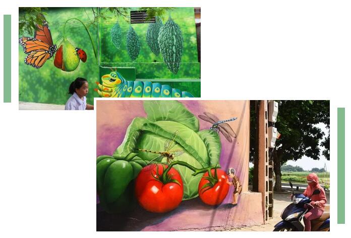 褚舍村以安全蔬菜種植業(yè)聞名,因此15幅大型壁畫重現(xiàn)了當?shù)剞r(nóng)民的日常生活畫面,從各種農(nóng)作物、蔬菜、果園,壁畫中一個純農(nóng)業(yè)小村的畫面給參觀者帶來一種自然和美麗的視覺效果。