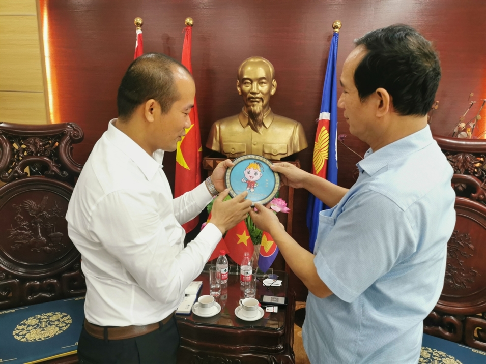 (廣西金沛教育執(zhí)行董事粟宥朝先生向越南駐南寧總領(lǐng)事黃玉榮先生贈送金小沛紀(jì)念品)