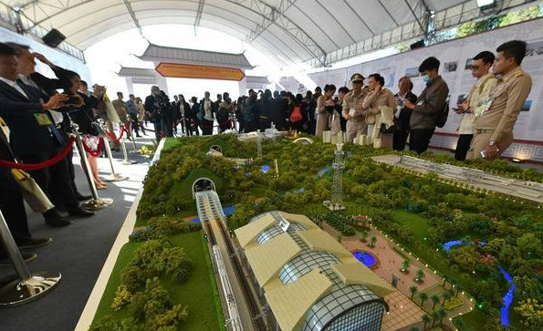 12月21日,在泰國(guó)東北部呵叻府巴沖縣,人們?cè)谥刑╄F路合作項(xiàng)目一期工程開(kāi)工儀式上參觀項(xiàng)目沙盤(pán)模型。