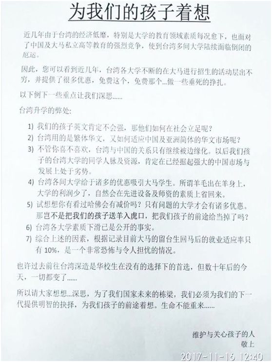 原標(biāo)題:馬來(lái)西亞中學(xué)瘋傳這封公開(kāi)信,臺(tái)灣怎么辦? 馬來(lái)西亞中學(xué)瘋傳一封“別讓孩子到臺(tái)灣念大學(xué)”的公開(kāi)信,在島內(nèi)引發(fā)關(guān)注。